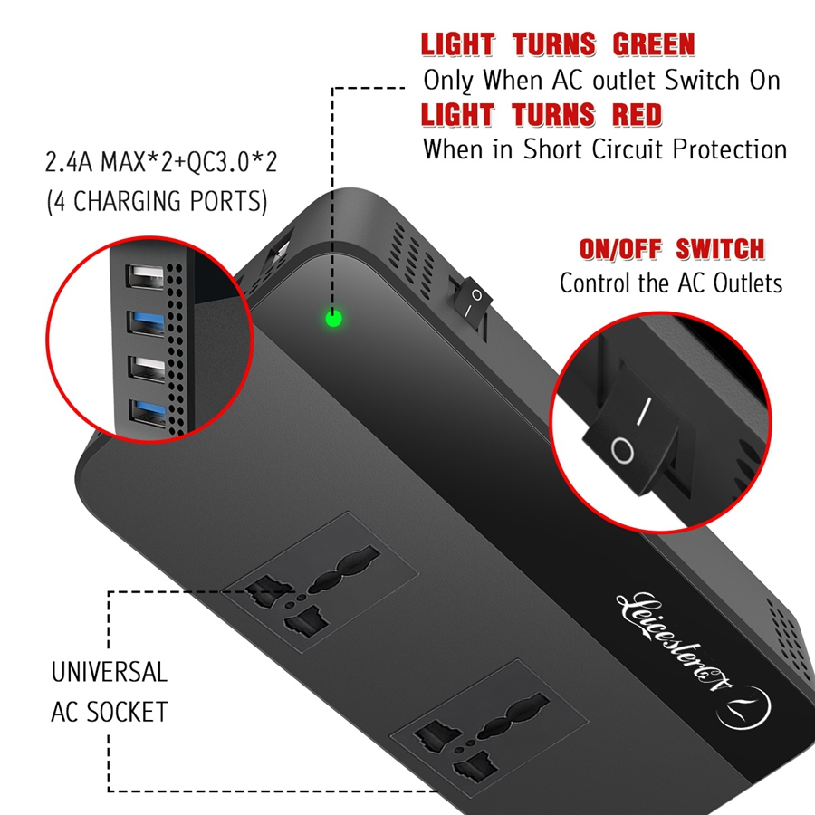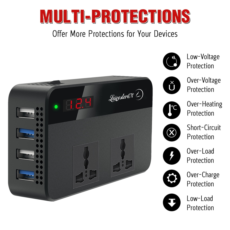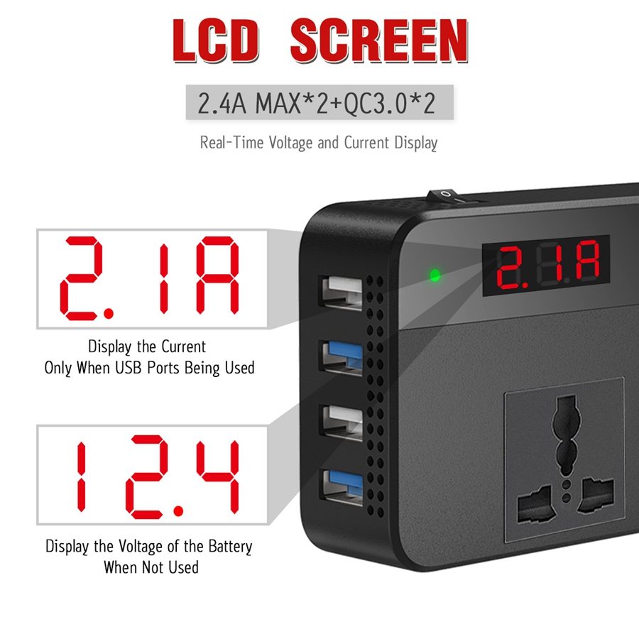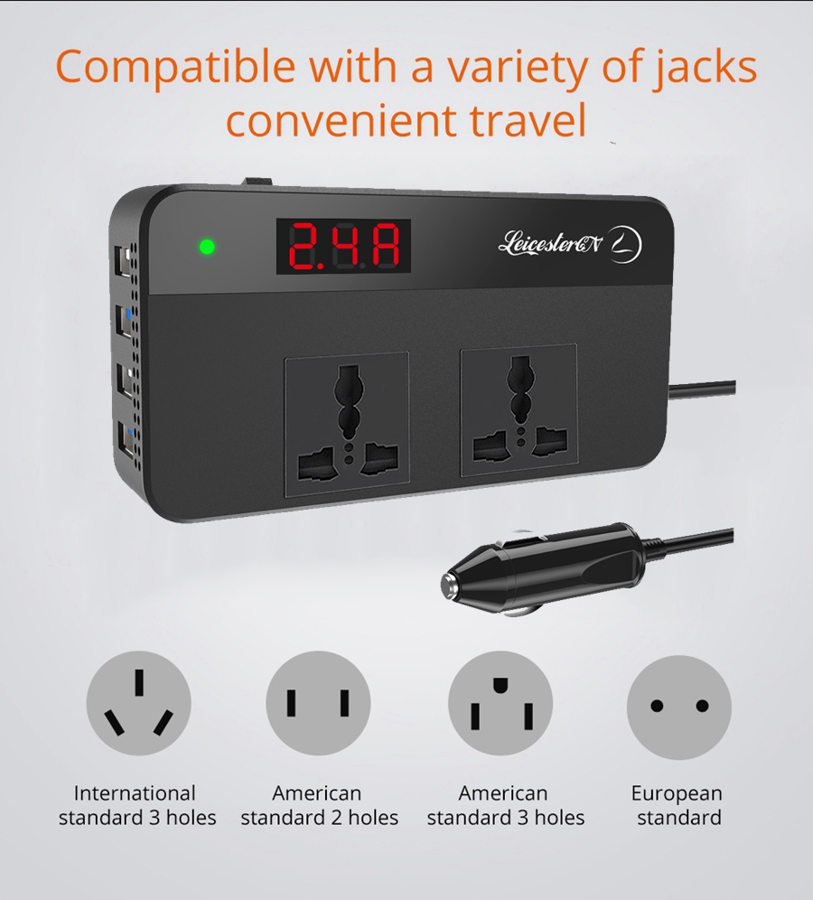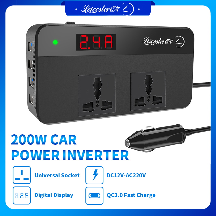LST 200W汽车电源转换器转换器DC12V to AC220V 2 AC插座4 USB充电器(2.4a Max*2+QC3.0*2快速充电)汽车配件电源转换器带有数字显示器
