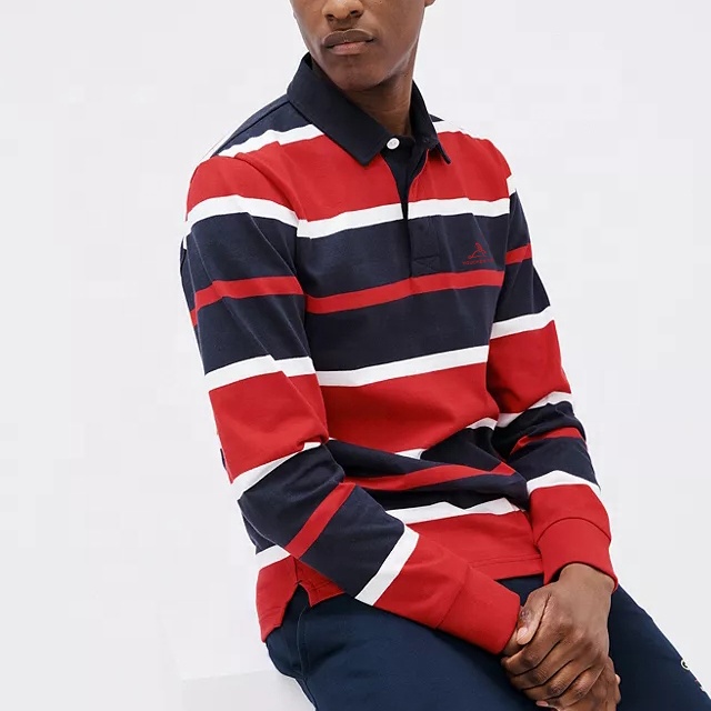 Men 100% Cotton Multiple Color Striped Long Sleeves Rugby Polo Shirt for Men Custom Embroidered Logo
