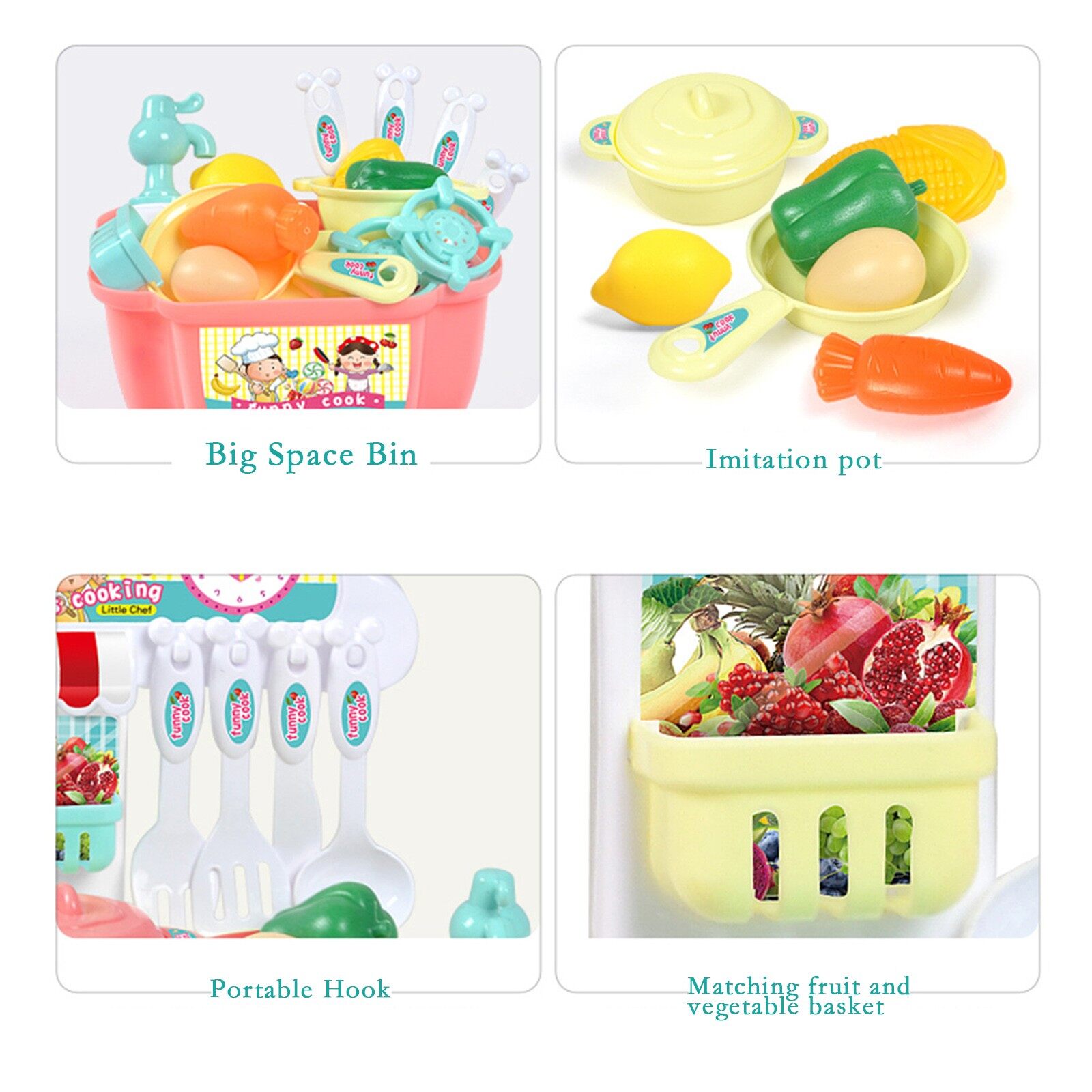 Features: Made of high-quality materials, it is safe for children, surrounded by rounded corners, smooth to the Contact, no burrs, no skin dae Help develop your child's thinking, creativity and thinking skills, and develop their hand-eye coordination and hand flexibility through their own operations Can let your baby know different tableware and different uses. In addition to the dining table, there are 24-26 other accessories in the product An Perfect toy for early childhood development