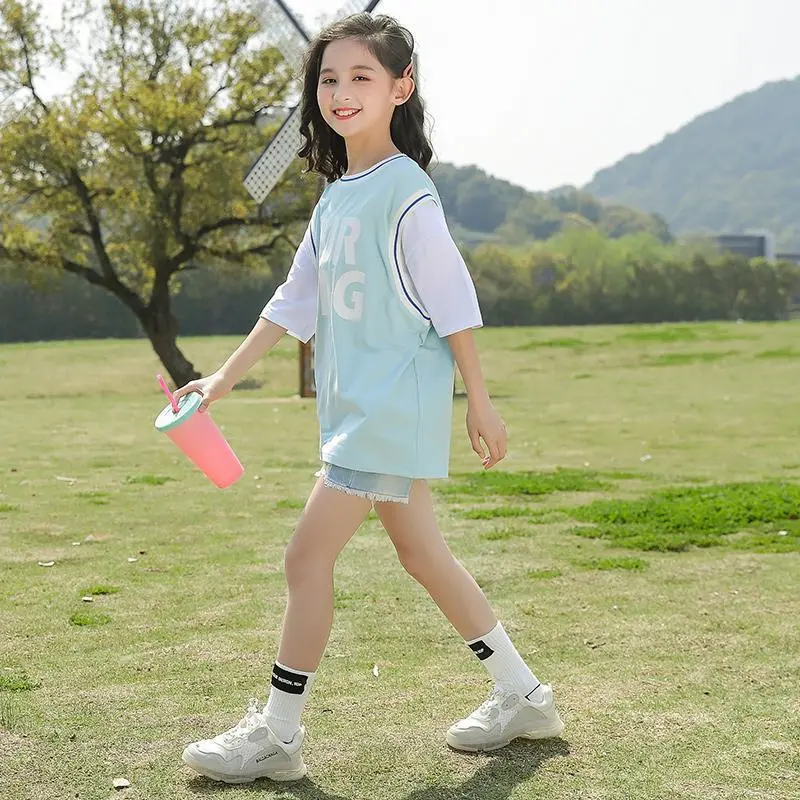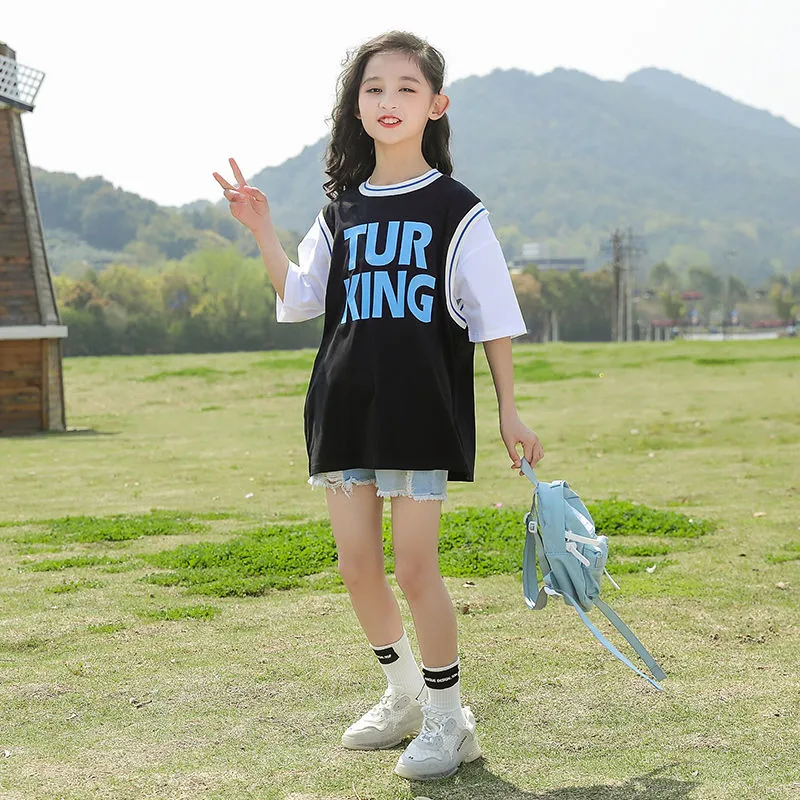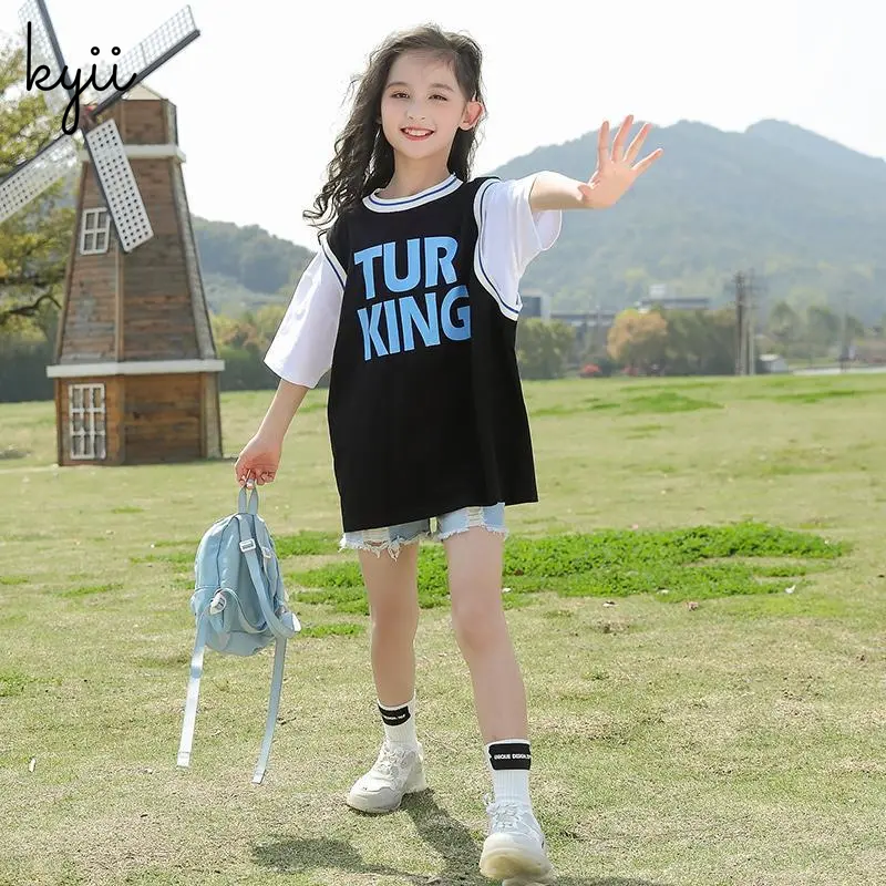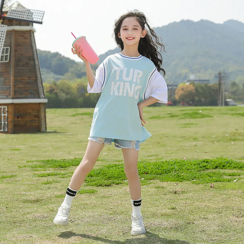 KYII女孩夏季中长袖字母PRNT T恤2022New韩国版儿童女孩礼服Ky011