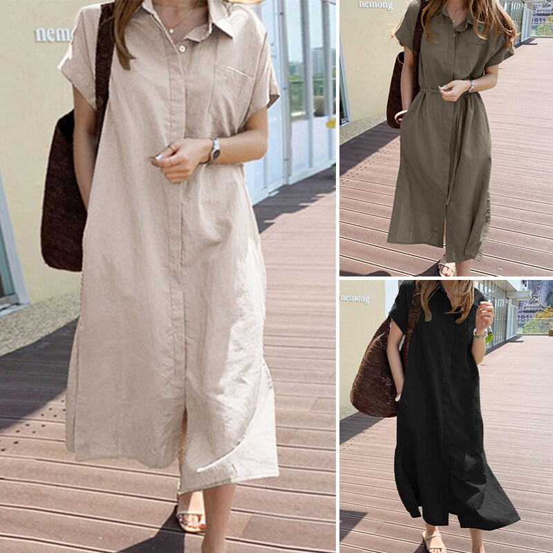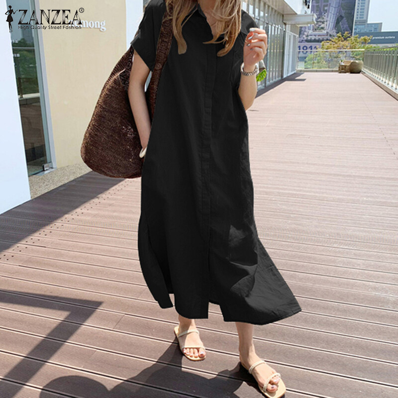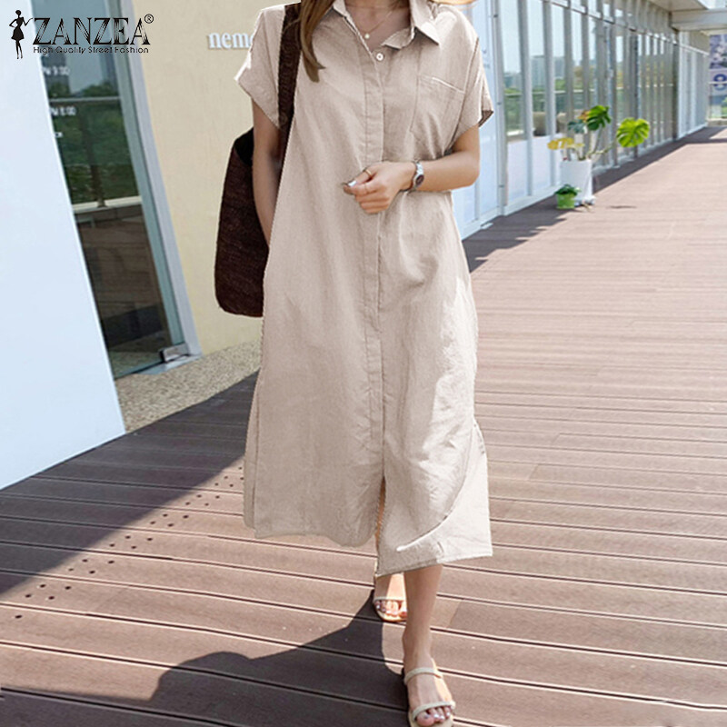 Zanzea韩国风格的女性短袖翻领纽扣衬衫连衣裙棉花平原Midi Sundress