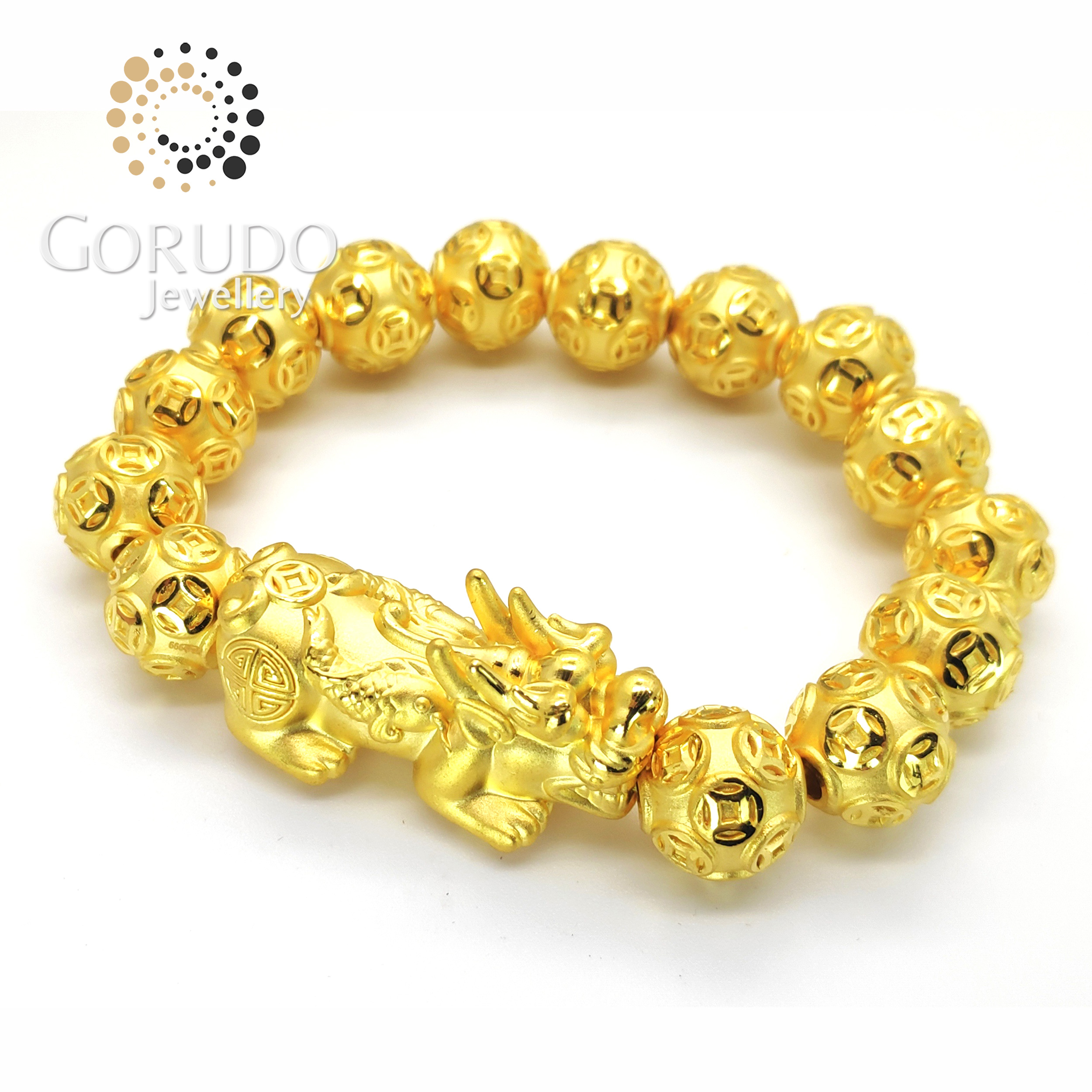 1 x Gorudo Jewellery Pure Gold 999 双鱼 Pixiu + 15 Auspicious Gold Coin Ball Charm Bracelet