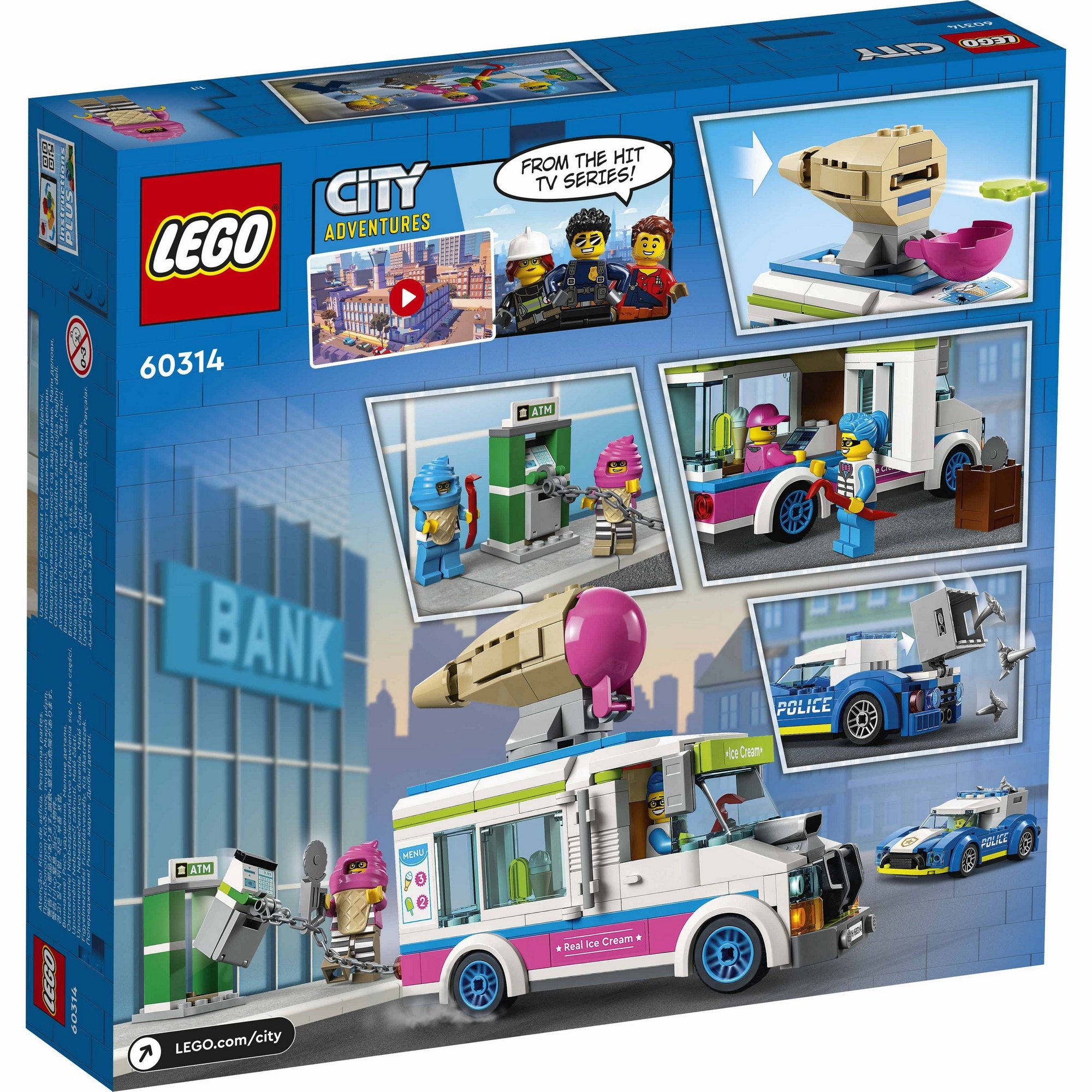 A crooks’ ice cream van, a cool police interceptor and 2 LEGO® City TV characters set the scene for action-packed play.