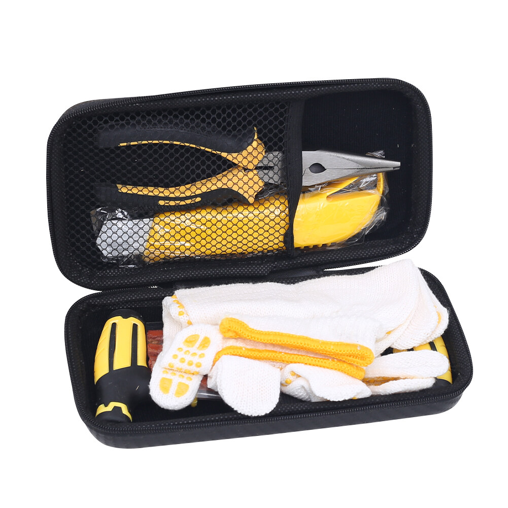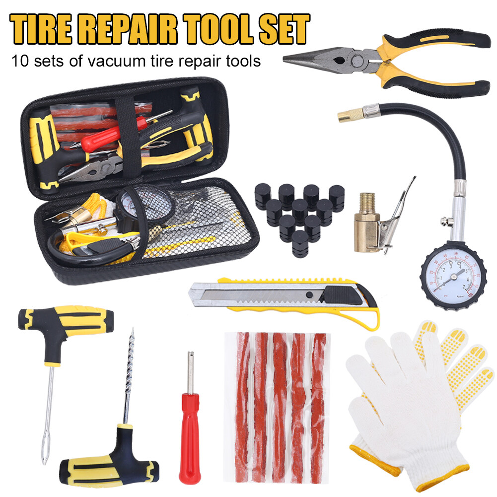*1. Car and bike tire repair kit for emergencies include plug string, reamer, plugger, gloves, and other tools.