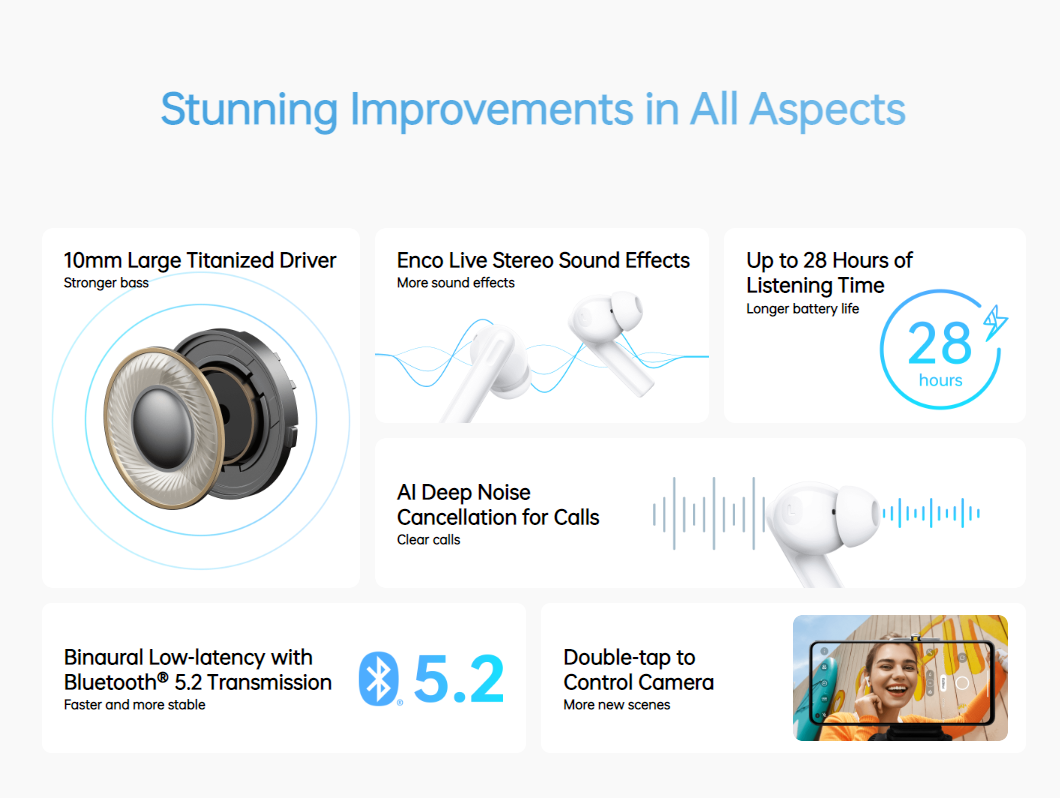 Oppo Enco Buds2 / 10毫米大钛驱动器 / Enco Live立体声音响效果 / AI深噪声取消呼叫