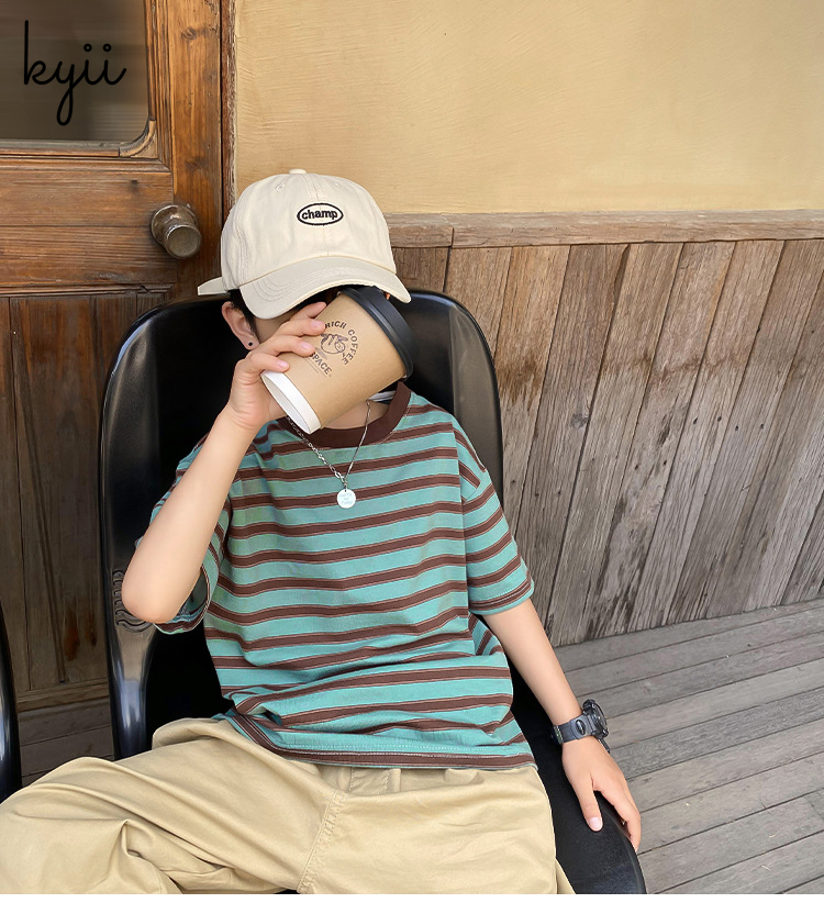 Kyii条纹短袖休闲男孩棉花夏季松散衬衫韩国衬衫kyb042