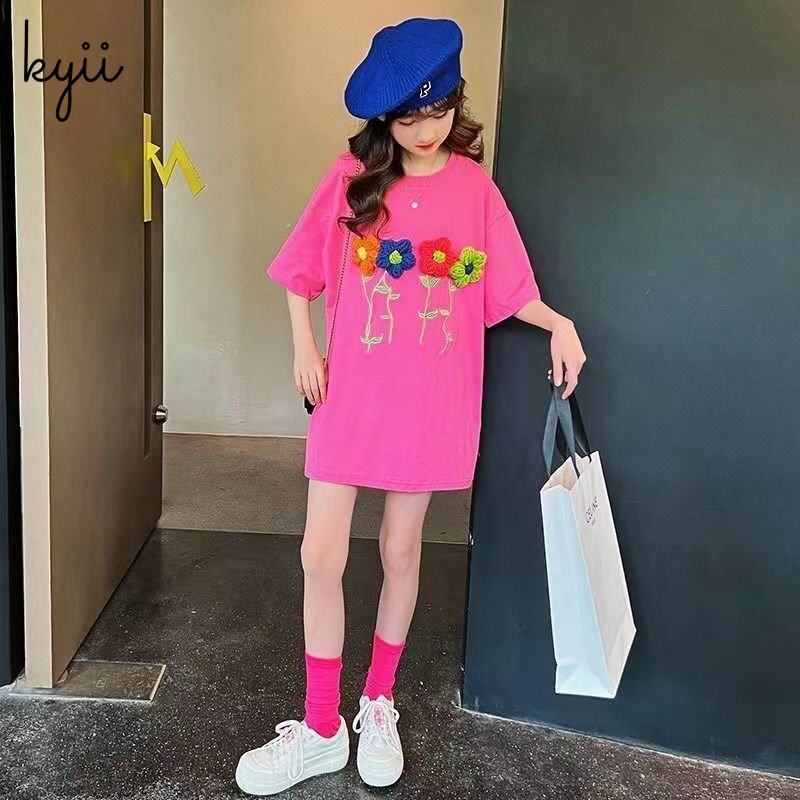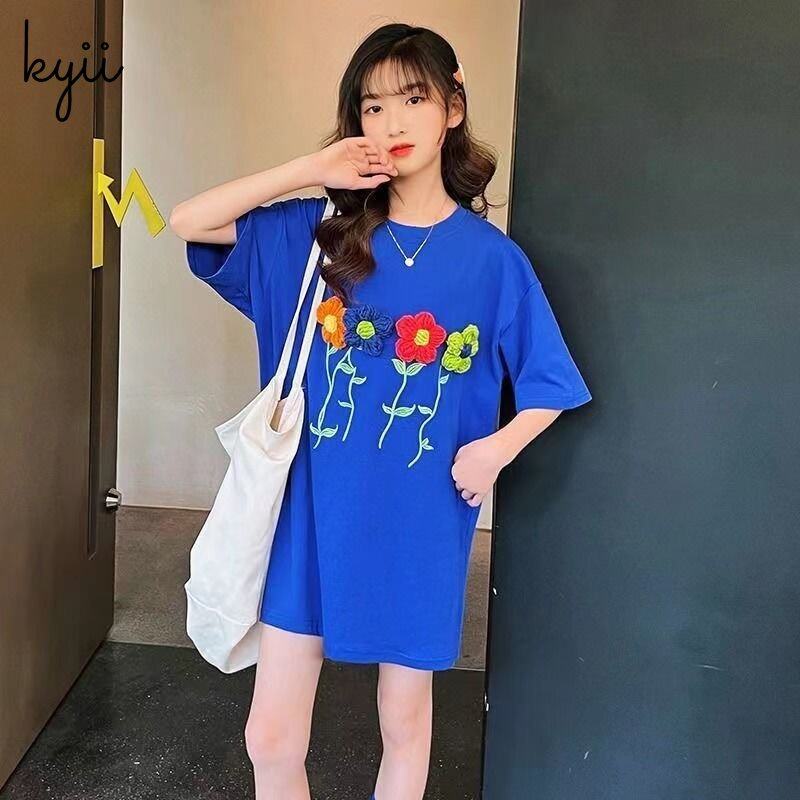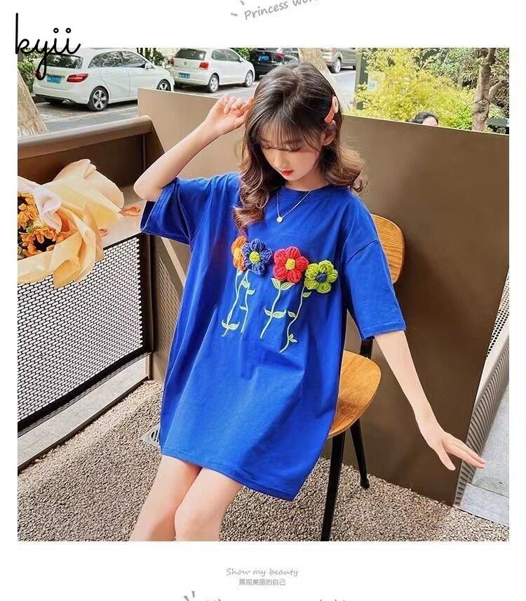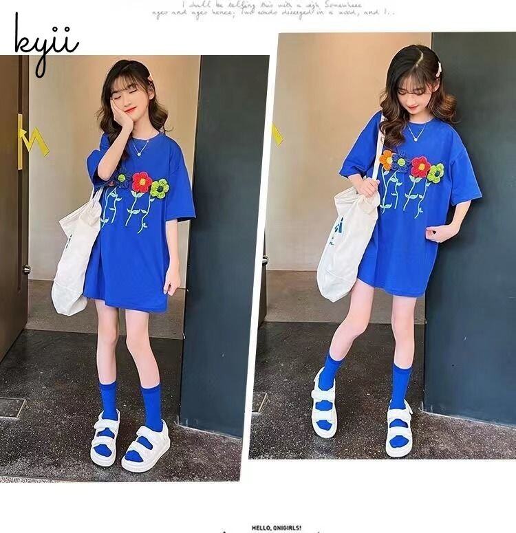 Kyii儿童女孩夏季圆颈连衣裙短袖休闲宽松连衣裙kyii0130