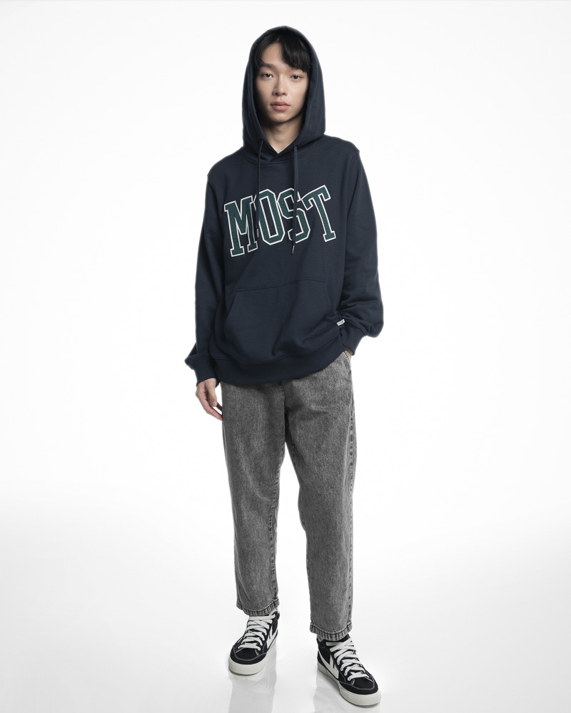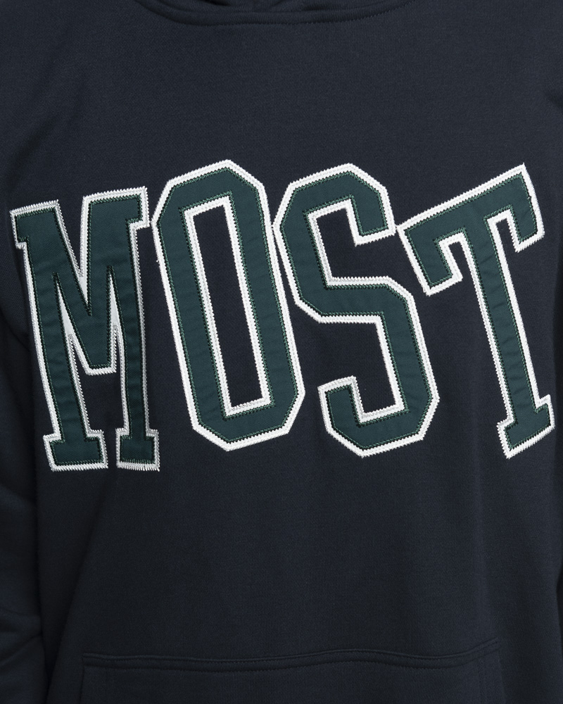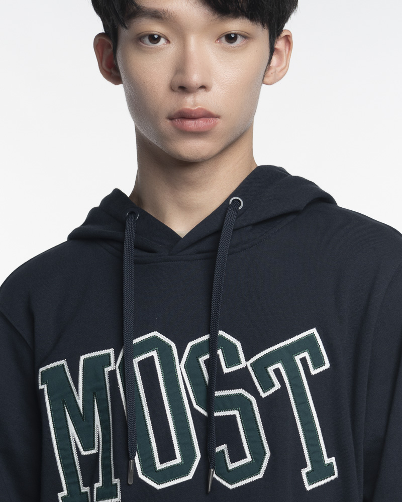 Yishion Men用袋鼠口袋和大多数口号贴片(dk。Blue)固体套头衫连帽衫