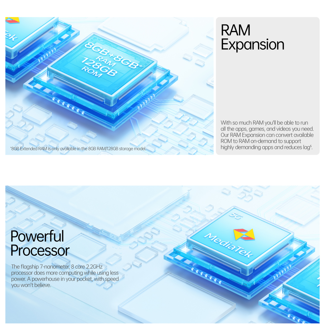 With so much RAM you’ll be able to run all the apps, games, and videos you need. Our RAM Expansion can convert available ROM to RAM on-demand to support highly demanding apps and reduces lag⁵.