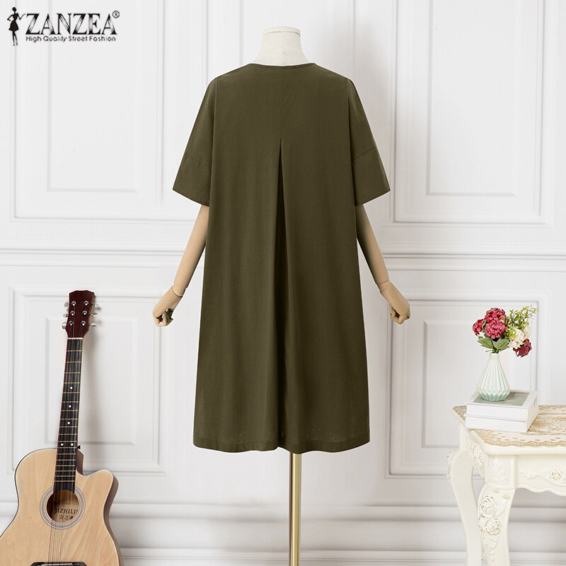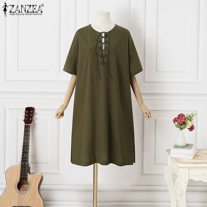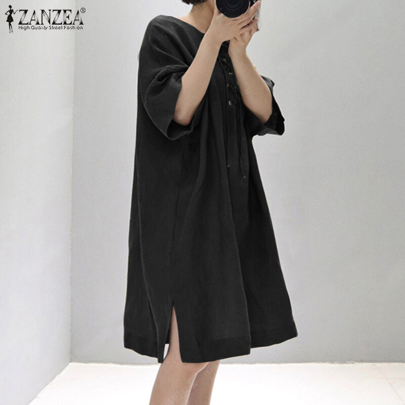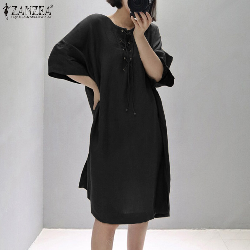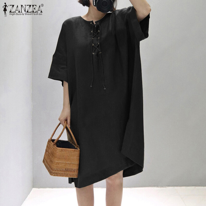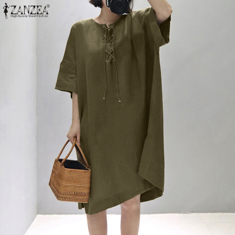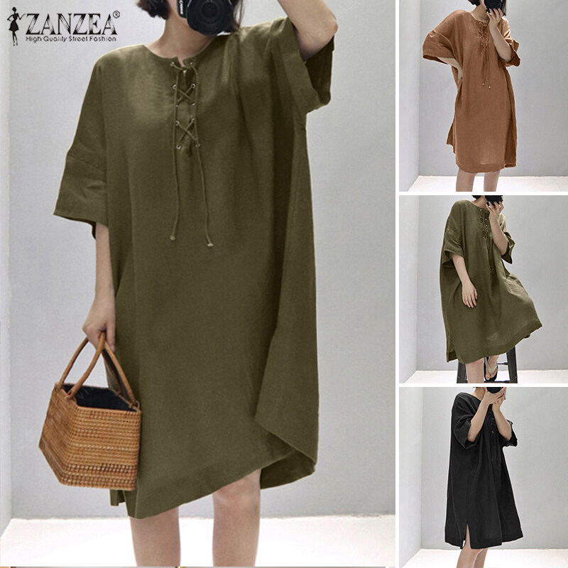 zanzea妇女复古休闲固体棉质棉布饼松散的O颈Midi连衣裙#8