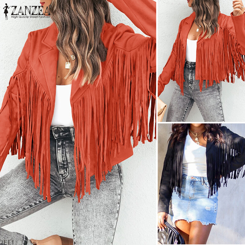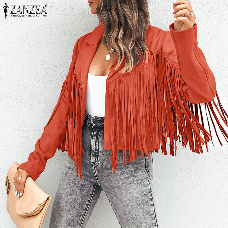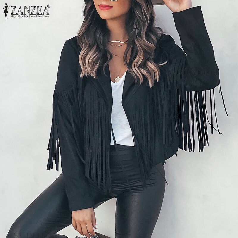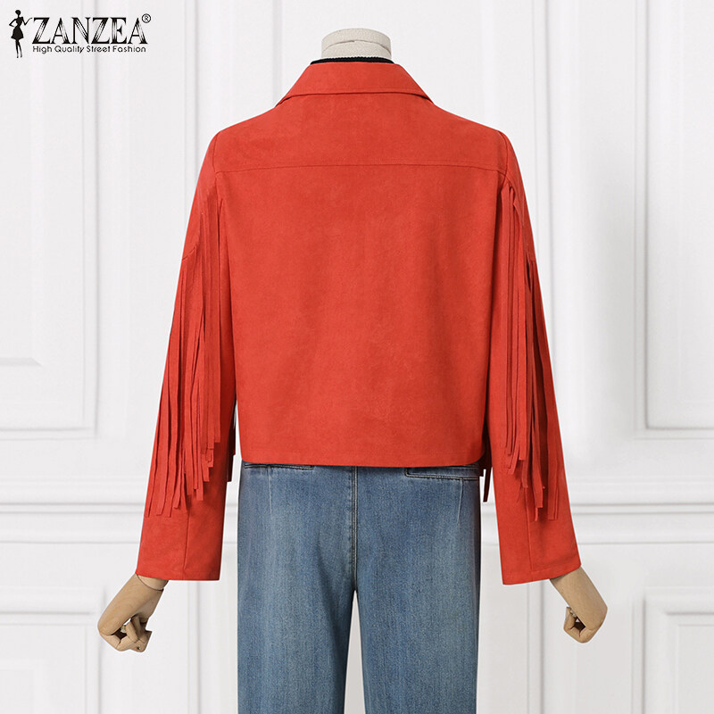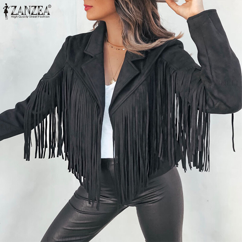 Zanzea Autumn Street时尚普通夹克女士长袖流苏装饰外套松散的外套#15