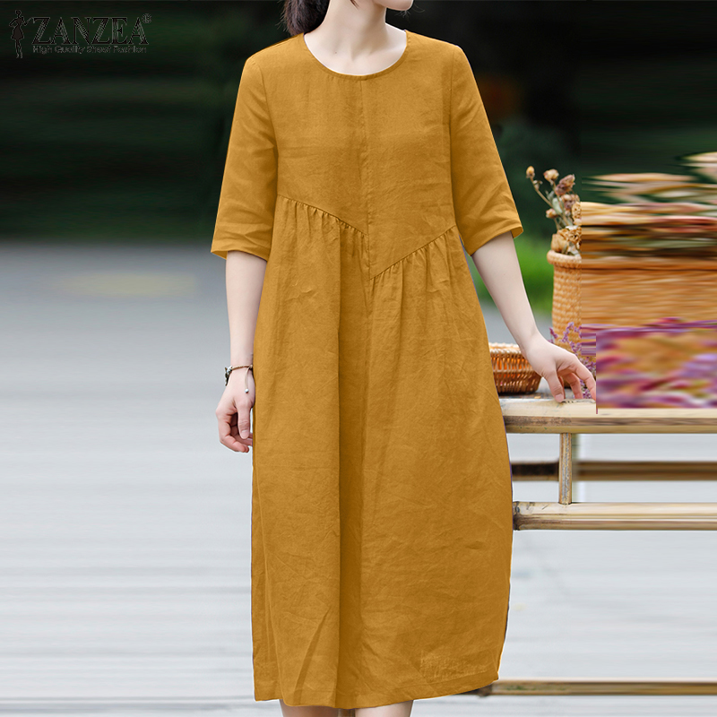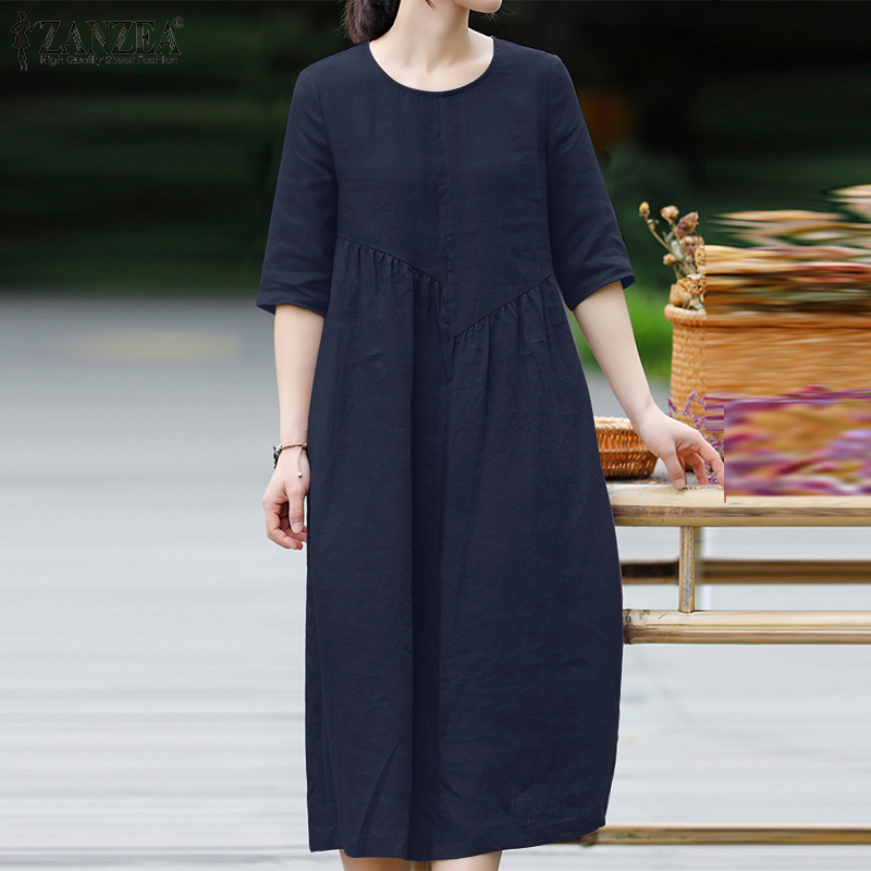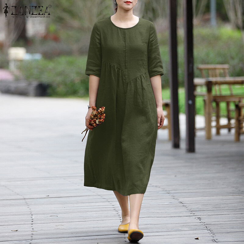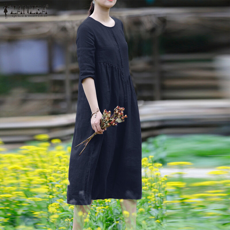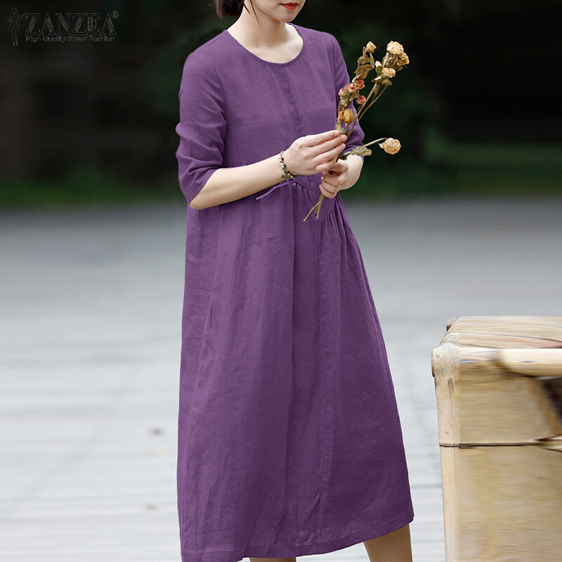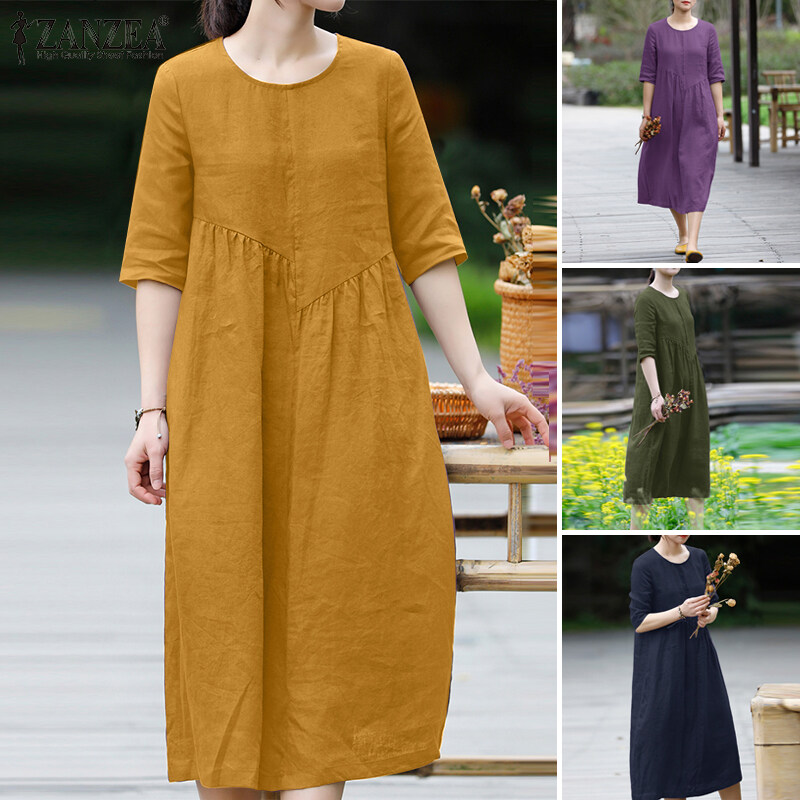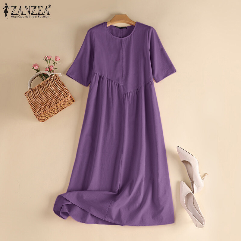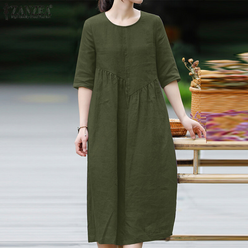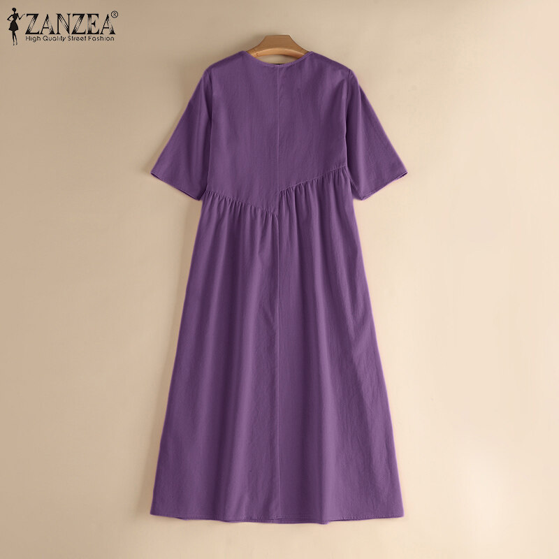 Zanzea妇女休闲棉质褶皱短袖Midi Dress Bohemian圆颈套装#8