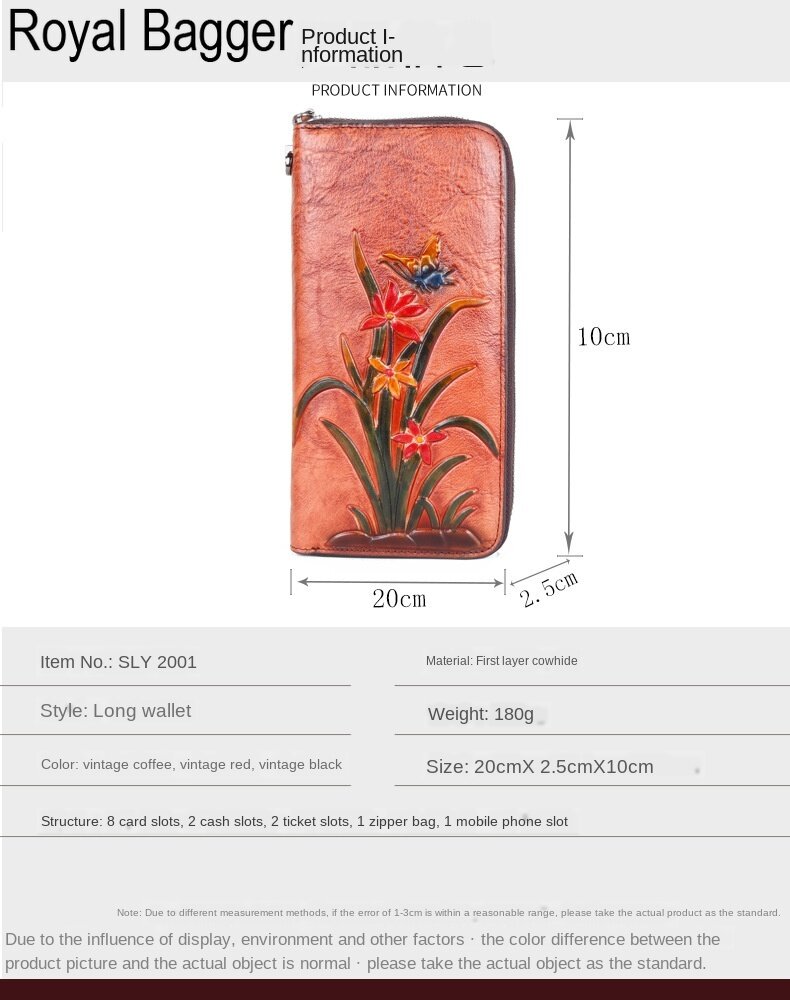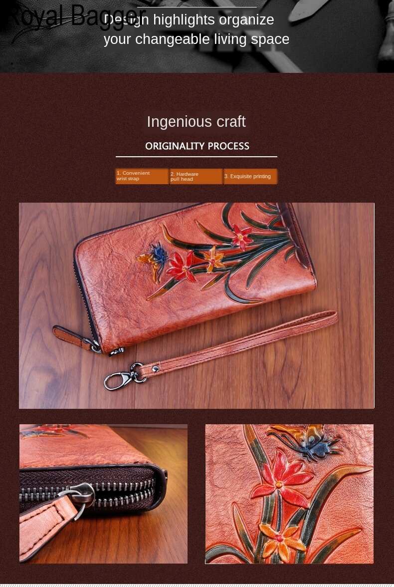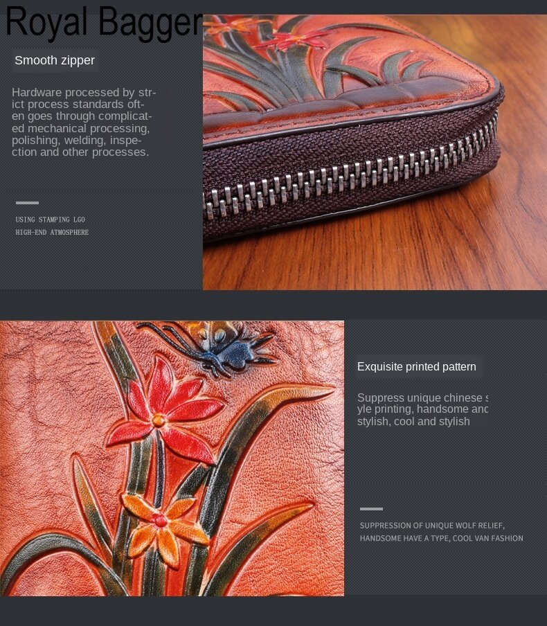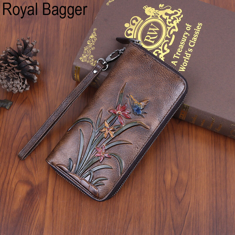 皇家袋装真正的牛皮革新时尚女子女孩长钱包钱包超级热容量复古花袋手提袋手提包女士多功能袋休闲多卡的位置钱包
