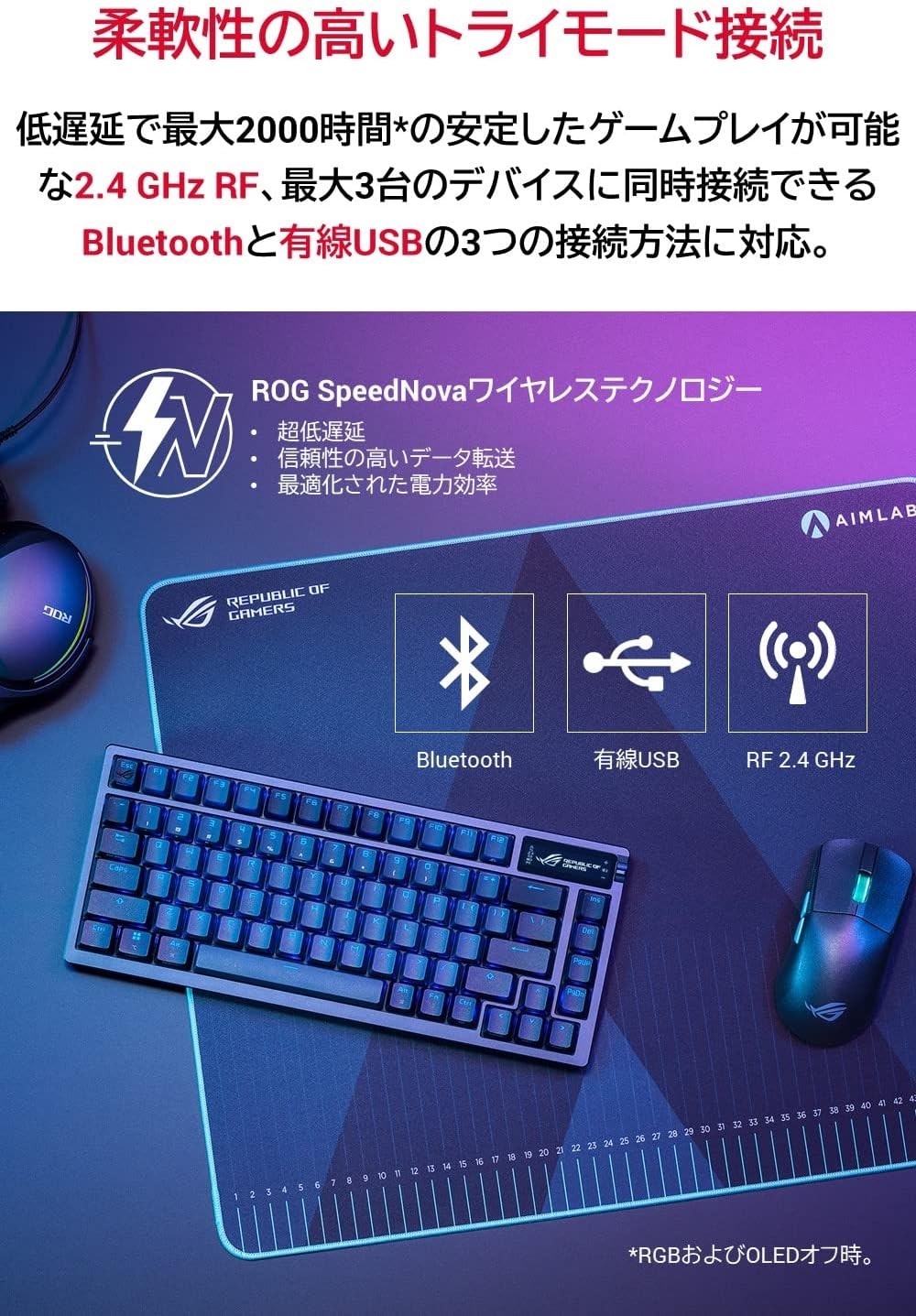 • 【TRI-MODED CONNECTION】With ROG SpeedNova wireless technology, you can enjoy up to 2,000 hours of low-latency gameplay with 2.4GHz RF wireless mode (OLED and RGB off), and you can also use standard wired USB