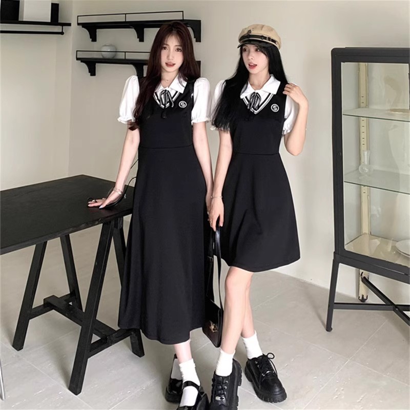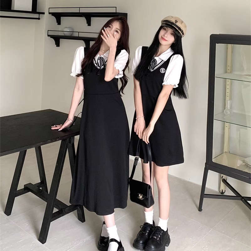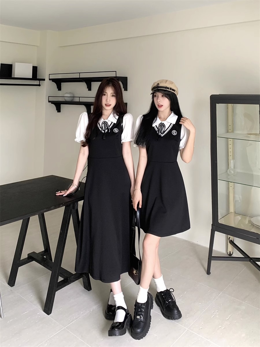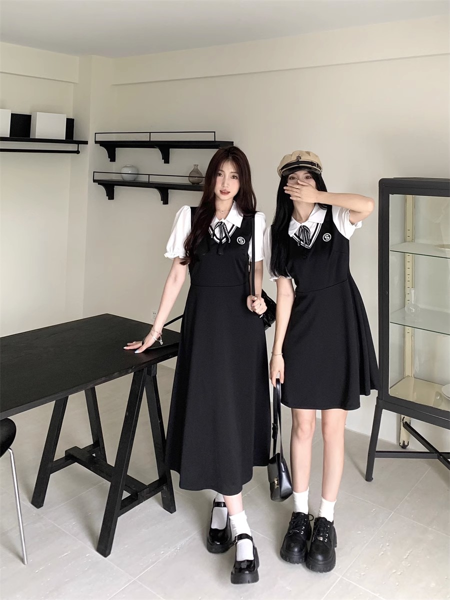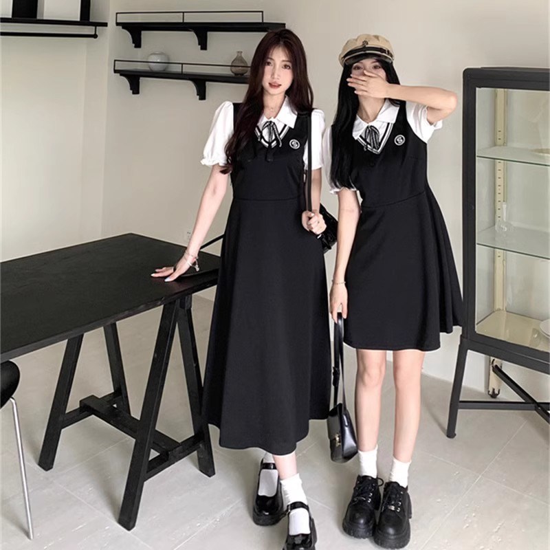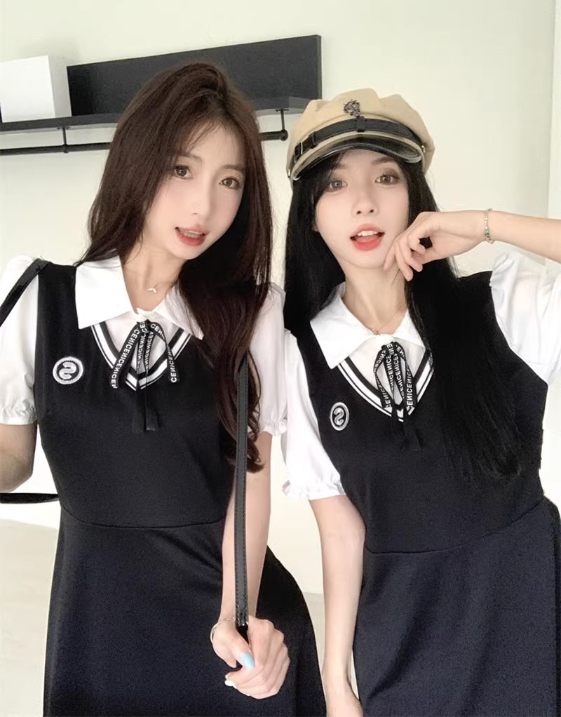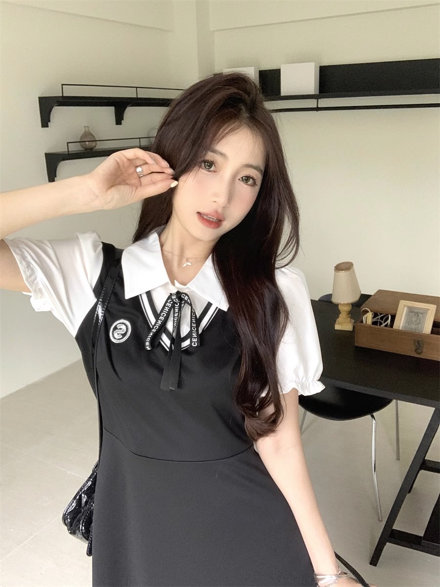 法式学院风假两件黑色polo连衣裙子女大码夏季收腰显瘦气质A字裙